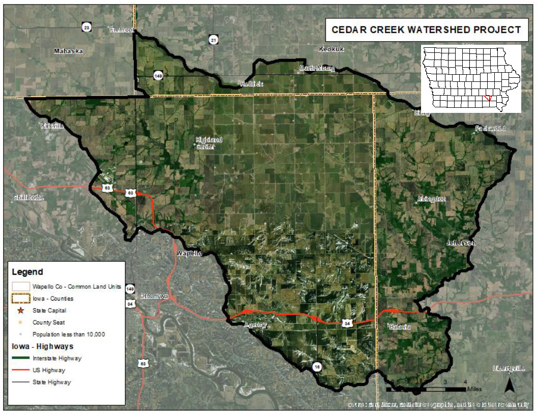 The Cedar Creek Partnership Project is a collaborative effort between Wapello, Jefferson, and Keokuk SWCDs. The watershed was identified as a statewide priority area in the Nutrient Reduction Strategy (NRS), and demonstrates conservation practices that have been proven to be most effective in reducing Nitrates and Phosphates. Through working alongside producers and their farm goals, conservation practices are chosen that best fits the landowner, the land, and the resource concern.